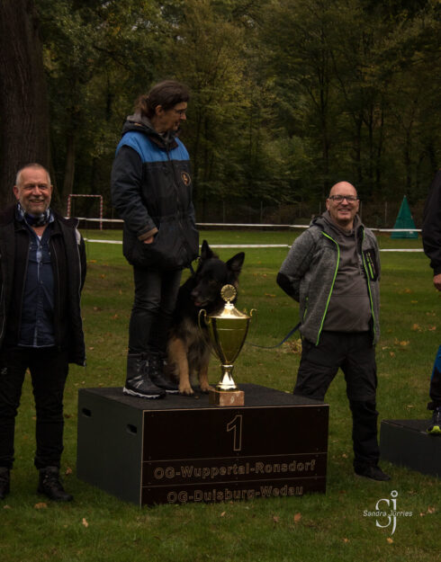 Eine Riesenfreude hat es uns bereitet, dass unser ältestes Mitglied Gisela Breuer mit ihrem Xaris vom Nonnenbachtal ihre IGP 1 mit einer Top Bewertung bestanden hat. Wo andere gesagt haben, sie schafft es nicht, hat uns der Ehrgeiz gepackt und es wurde heute belohnt. Die beiden machten in A97, B93 und C98 – Gesamt 288. Wir freuen uns sehr für Gisela.